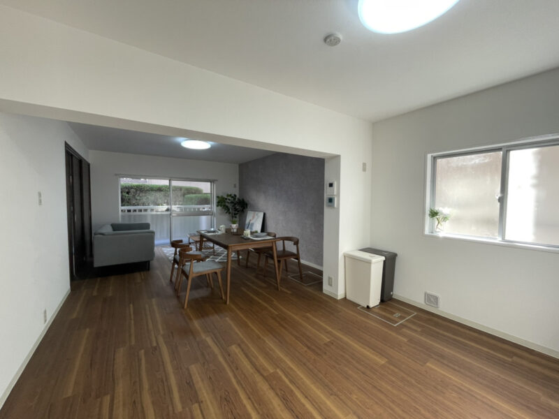 LDKはゆとりのある15畳以上。南向きにつき陽当り良好で、明るく開放感のある住空間が魅力です。