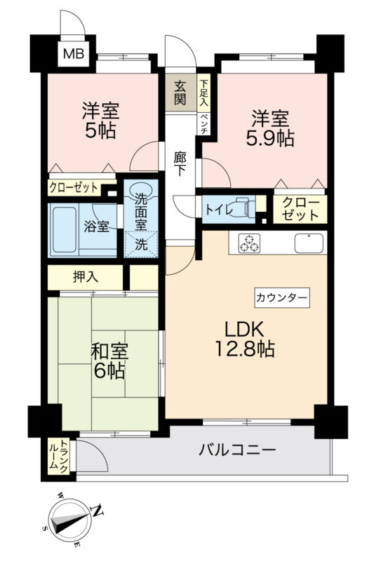 LDK12.8畳 洋室5.9畳 洋室5畳 和室6畳 |